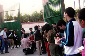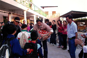 還記得那天,澳門陳瑞祺永援中學的張校長率領全校教職員,遠道而來探訪我院,他們下午二時許便到達,因為我院的中,小學生都上學去了,只有幼兒園來迎接,當我們介紹了院舍及設備後,就一起拍照留念。一切完成後時間尚早,學生要四時後才放學回來,他們卻很有心希望能見孩子逗他們開心。幾位老師商量,如何以最有效的方式,讓孩子一進院門就產生一種驚喜感。於是,他們分列院門兩旁,把預備好的糖果食品,由幾位最懂得逗樂孩子的同事捧著,等到四時三十五分左右,孩子們三三兩兩的陸續回來。他們竟像歡迎大人物蒞臨似的,夾道歡迎並以各種禮遇方式送上好吃的,所有孩子被逗得樂不可支,這一場面給他們留下深刻的印象,永誌不忘!