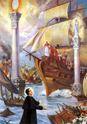 在這一望無際的大海中,聳立了兩根彼此相距不遠、又高又結實的圓柱。在其中一根上面放著一尊無玷童貞的聖像,腳下掛著寫有「進教之佑」(Auxilium Christianorum) 字樣的巨型字牌。在另一根更高和更大的圓柱上面,敗放著一個與圓柱大小相稱的巨型聖體,下面亦有一塊字牌,寫著「信友的救援」(Salus credentium) 這幾個字。