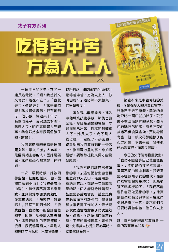 鮑思高家庭通訊 • 第二百三十四期 舒卷話題 是要讓壞人怕好人而不是要好人怕壞人 孩子犯錯是出於浮躁多於明知故犯 葉際趨修士安息主懷 夢啟航:快樂良友 鮑思高與現今的青年 原來聖人也會開玩笑:狂歡日 鳴謝 我的傳教生命就是:粵華!粵華!粵華! 慈青日 2013 新教友的信德 「追尋•基督」 聖母小學六十周年校慶晚宴 尋聖之旅 母佑會來華傳教九十周年感恩聖祭(香港) 慈善步行活動 賈利哀勞11 塞外人語:返回前線 讀者心聲 世界之窗 天父也用 Whatsapp:See思 我所認識的天主忠僕畢少懷神父(其二) 再說世青情 教子有方:吃得苦中苦 方為人上人 天人療法