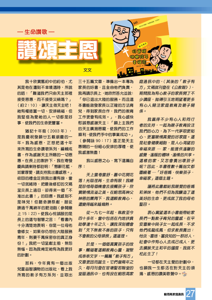鮑思高家庭通訊 • 第二百三十五期 舒卷話題 天主要求我們的世界變得愈來愈好 夢啟航:魔術背後 我時常需要眾人的幫助 鮑思高指導青年成聖 預防教育法的神奇秘密 鳴謝 母佑會來華傳教九十周年 聖母書院鑽禧校慶 慈幼會來台 50 週年慶典 小學慈青日 港澳第三次牧民常會 中六信仰生活營 協進會步行籌款 協進會聖類斯中心長洲朝聖 『瑪利亞的信德』聖母晚會 人性的我與奉獻犧牲的可貴 慈幼聖召日 讀者心聲 塞外人語:家庭精神 賈利哀勞11 世界之窗 天父也用Whatsapp:唔話得(I) 生命讚歌:讚頌主恩 用積極態度把握當下
