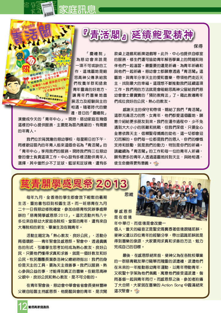 鮑思高家庭通訊 • 第二百三十七期 舒卷話題 備受青年愛戴的人賺得一切 原來聖人也會開玩笑:魔鬼去度假 夢建造:鎖定目標 要讓青年明白罪惡的醜陋和德行的美好 鳴謝 慶祝斯德望沈道爾修士列真福品 DB200 慈幼大家庭靈修營 來台金禧閉幕禮 『青活閣』延續鮑聖精神 慈青開學彌撒 自然生態親子營一天遊 開心暑期天 良友之聲廣告 心智醒 聖母媽媽親自帶領著我(下) 「思展藝能 高才盡演」 「信德年信仰培育課程」分享(二) 鮑思高預防教育法研討會 賈利哀勞 11 塞外人語:恩將仇報 世界之窗 讀者心聲 天父也用 Whatsapp 教師心語:孩子值得我們付出 告別悲慘童年 重獲新生命 拿出自己的五餅二魚