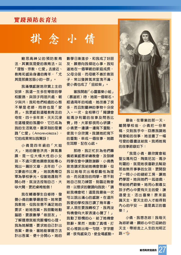 鮑思高家庭通訊 • 第二百三十九期 舒卷話題 耶穌– 我的朋友 原來聖人也會開玩笑:「有男孩出售嗎?」 人人都可以成聖 夢建造:領洗背後 一位備受歡迎的告解神師 慈幼靈修:修和篇 鳴謝 你曾認識畢少懷神父嗎? 慶禮院再現 英文學習日 協進會週年大會 慈青牧民辦事處快訊 鍛鍊家實踐 讀者心聲 悼孔陳桂卿女士 塞外人語:願天主永受讚美 賈利哀勞11 世界之窗 天父也用 Whatsapp 逆流而上 身心受益 掛念小倩 活出聖體聖事