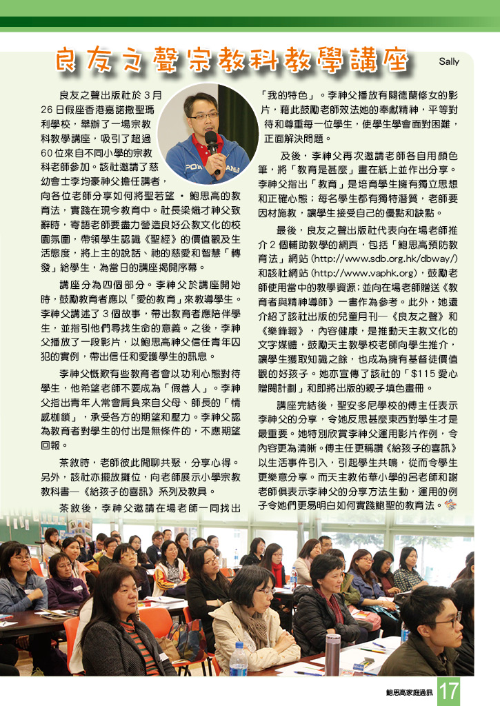 鮑思高家庭通訊 • 第二百四十六期 舒卷話題 天主賜給我們一位真實的母親 夢成真:夢想初現 天主的話存留在你們內 一個有心的人 讓我們做一位充滿慈悲的老師 慈青日 「臥底」的生活 聖母樓祝聖暨揭幕典禮 兩院同慶鮑聖瞻禮 香港仔工業學校八十周年感恩彌撒 喜樂侍主 以生命作福傳 彌額爾盧華中心成立紀實 鳴謝 良友之聲宗教科教學講座 塞外人語:預許之地? 慈善步行活動 賈利哀勞11 世界之窗 讀者心聲:神貧的眾人之父 聯校公教老師及牧民工作者退省日 欽定聖母進教之佑瞻禮日200 周年 天父也用Whatsapp:奇蹟→記號 這間學校改變了我一生(上) 過來人福傳者