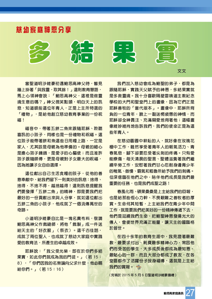 鮑思高家庭通訊 • 第二百四十七期 舒卷話題 慈幼家庭,你們在尋找什麼? 夢成真:美夢紮根 效法瑪利亞,作聖神的合作者 鮑思高教育的路與樂研討會(澳門) 心胸廣闊和務實 張心銳執事晉鐸紀要 獻身生活年聖像巡迴祈禱會 慈善之星步行籌款2015 小學慈青日 鄧鏡波書院創建五十週年回憶點滴 慈幼聖召日 中六信仰生活營 天主教母佑會蕭明中學宗教週 喜樂舍 鳴謝 「義工•Family•2015」 「如何從遊戲中建立親子關係」講座 讀者心聲 精彩人生 祝福傳意辦公室新錄音室 尋找傳教士的足跡 賈利哀勞11 塞外人語:回顧、前望 世界之窗 天父也用 Whatsapp:吸呼 多結果實 別拉住我不放