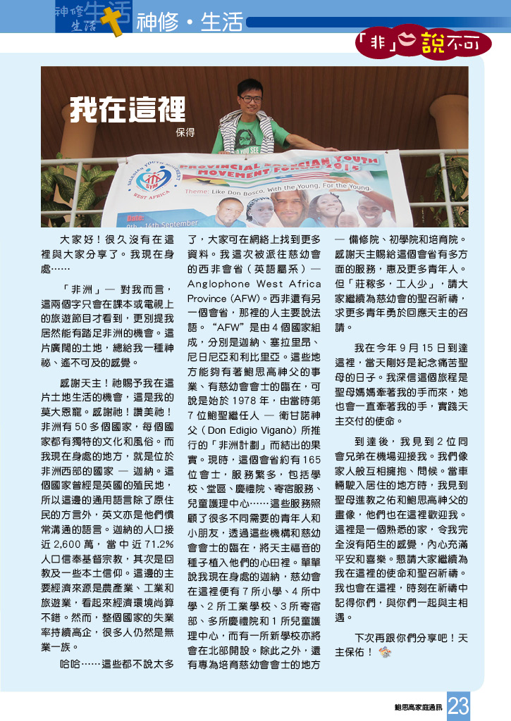 鮑思高家庭通訊 • 第二百四十九期 舒卷話題 慈幼(Salesian、撒肋爵的、沙雷氏的) 與我靈! ( 取其餘! ) 夢成真:神奇痊癒 宗教教育的首要地位 鳴謝 2014 年收支結算總表 「青年慈父與導師」分享會 協進會專題講座暨慶祝入會金銀慶 ByeBye 暑期天 蓓蕾荏苒時 8.16 鮑思高崗上的反思 慈青開學感恩祭2015 15-16 年度慈青戰友第一次培育 慈青善會幹事交流日2016 新學年牧民常會 聖類斯中學新學年快拍 讀者心聲 善書推介 最後留言 慶祝救主降生 賈利哀勞11 塞外人語:一個真實的故事 世界之窗 『非』說不可:我在這裡 讓孩子成為「良好公民,熱心教友」 天父也用Whatsapp:悔 聖召分享:天主為我選擇的道路 悼敬愛的麥卉貞修女 – 馨香的祭品 天父的家書