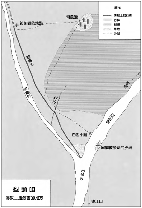 在警察局長和幾個士兵的間接暗示下,使兩位傳教士在一個近乎古怪的場地上找到了兩位殉道者的屍體,他們把屍體搬回連江口。(99)
