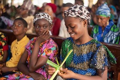 A teenage girl makes a cross with a palm during the Palm Sunday Mass at Christ the King Catholic Church in Ibadan, Oyo, Nigeria, on March 24, 2024. (photo: Tolu Owoeye / Shutterstock)