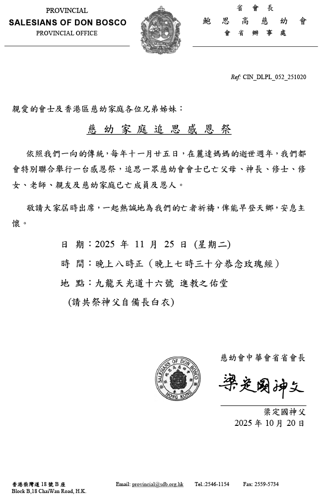 慈幼家庭追思感恩祭 (2025 年 11 月 25 日,星期二)