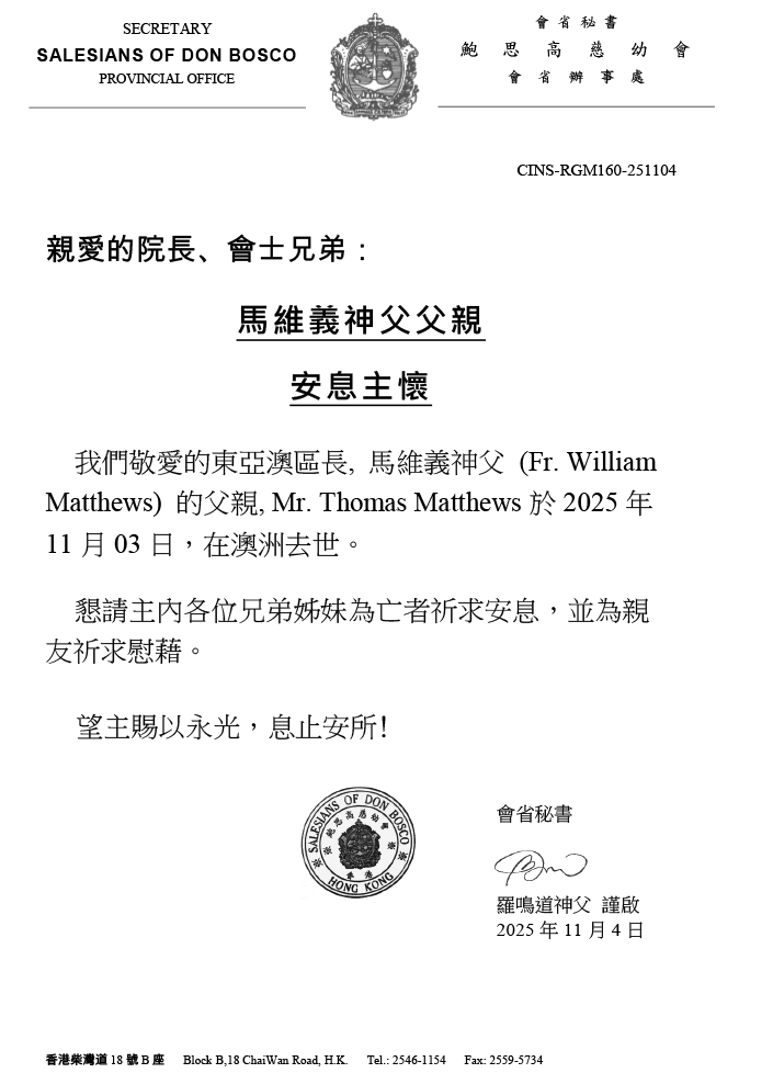 通告:馬維義神父父親 安息主懷