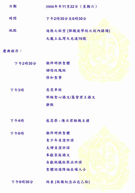 為慶祝本年度的「基督普世君王節」,「慈幼會」及「傷健聖體御侍團」特聯合於 2008 年 11 月22 日(星期六)下午 2 時 30 分至 6 時 30 分假九龍土瓜灣天光道 16 號進教之佑堂 (鄧鏡波學校) 舉行隆重慶典,並蒙陳日君樞機答允蒞臨主禮。