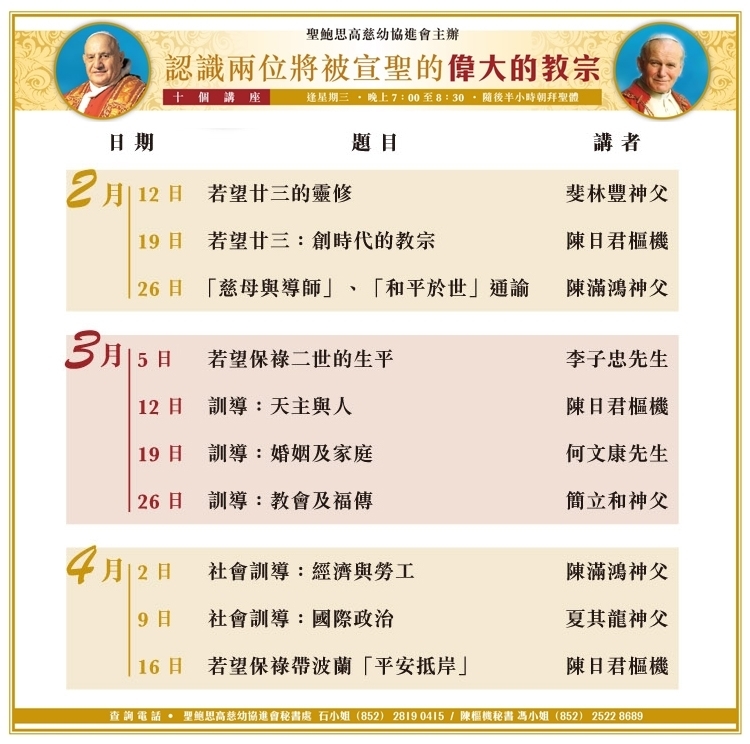 「認識兩位將宣聖的偉大教宗」講座 / 會省公告, 未分類 / 作者: admin 近日會省公告 慈幼家庭追思感恩祭 (2025 年 11 月 25 日,星期二) 2025-10-23 張鍾來神父 安息主懷(訃聞) 2025-08-20 通告:慈幼家庭神修日2025(香港及澳門區) 2025-05-22 謝家賢神父殯葬安排 2025-03-26 通告:慈幼家庭追思感恩祭 2024-10-22