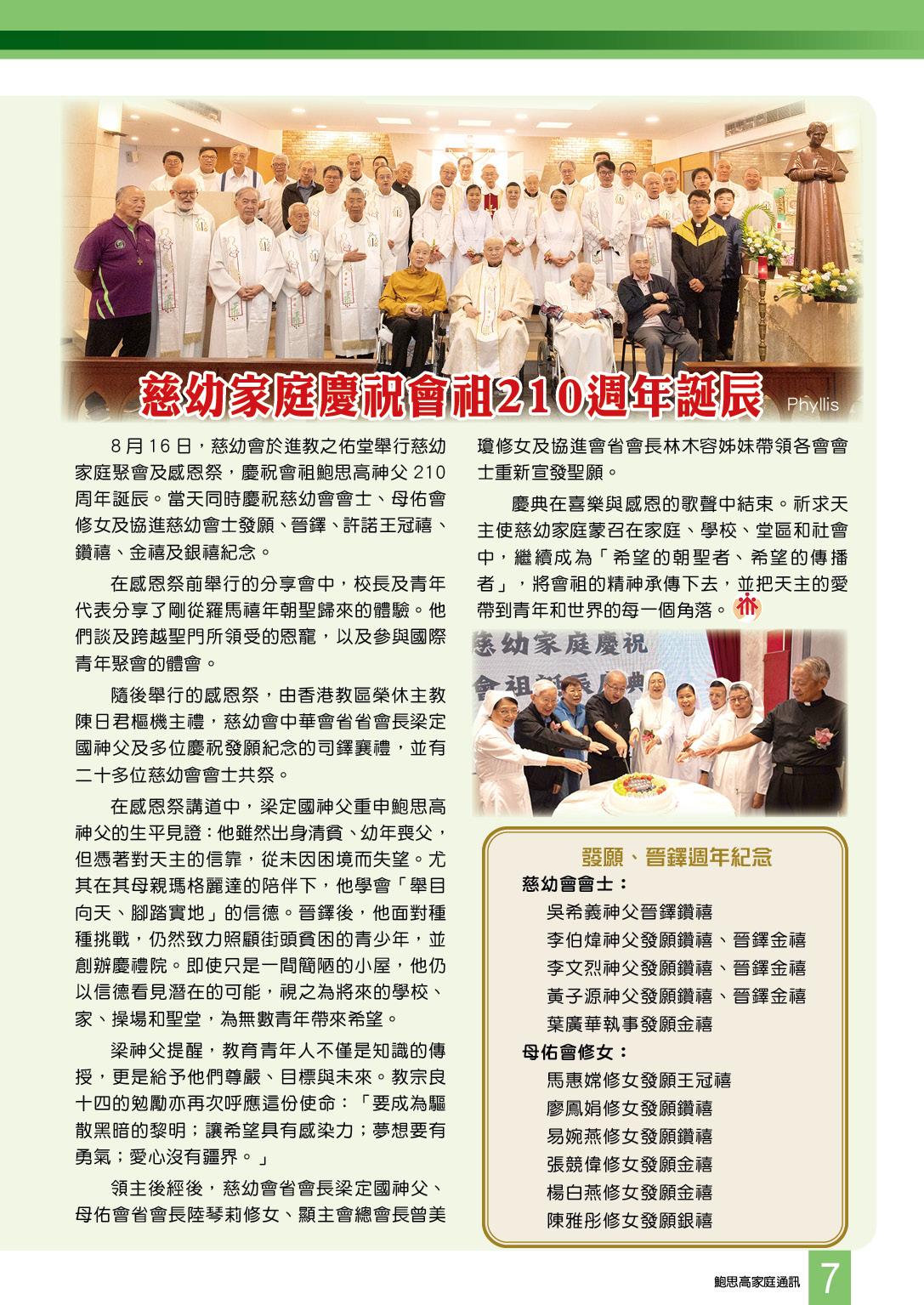8月16日,慈幼會於進教之佑堂舉行慈幼家庭聚會及感恩祭,慶祝會祖鮑思高神父210周年誕辰。當天同時慶祝慈幼會會士、母佑會修女及協進慈幼會士發願、晉鐸、許諾王冠、鑽慶、金慶及銀禧紀念。