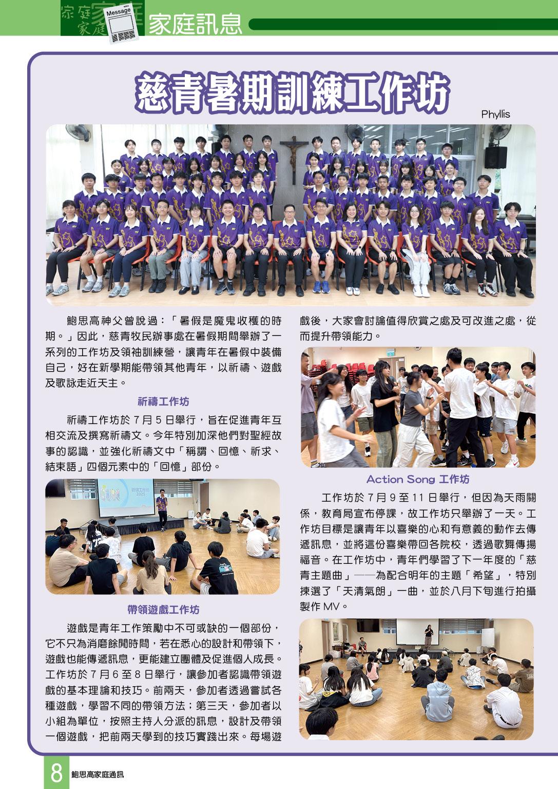鮑思高神父曾說過:「暑假是魔鬼收穫的時期。」因此,慈青牧民辦事處在暑假期間舉辦了一系列的工作坊及領袖訓練營,讓青年在暑假中裝備自己,好在新學期能帶領其他青年,以祈禱、遊戲及歌詠走近天主。