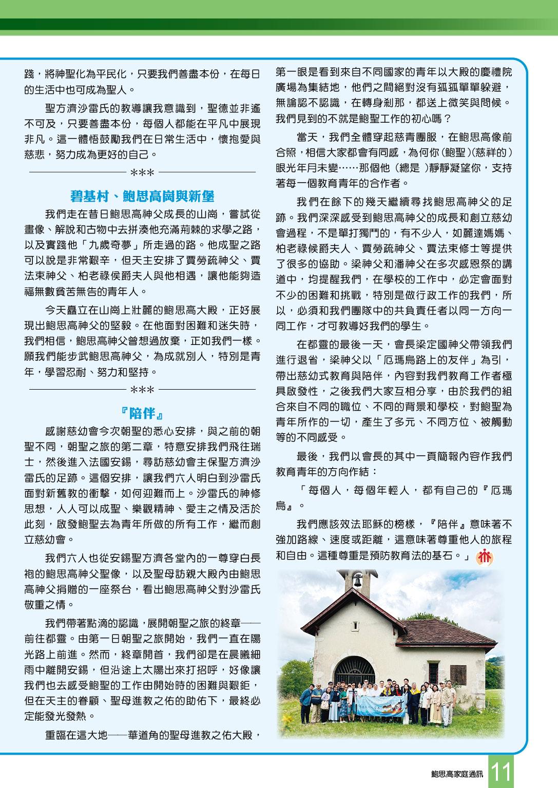 感謝慈幼會今次朝聖的悉心安排,與之前的朝聖不同,朝聖之旅的第二章,特意安排我們飛往瑞士,然後進入法國安錫,尋訪慈幼會主保聖方濟沙雷氏的足跡。這個安排,讓我們六人明白到沙雷氏面對新舊教的衝擊,如何迎難而上。沙雷氏的神修思想,人人可以成聖、樂觀精神、愛主之情及活於此刻,啟發鮑聖去為青年所做的所有工作,繼而創立慈幼會。