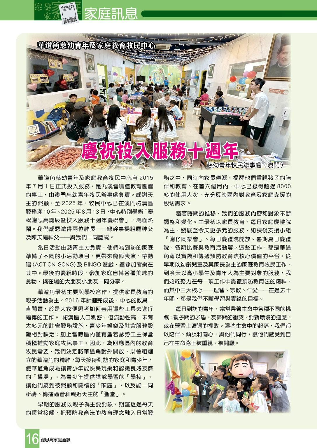 華道角慈幼青年及家庭教育牧民中心自2015年7月1日正式投入服務,是九澳雷鳴道教育團體的事工,由澳門慈幼青年牧民辦事處負責。感謝天主的照顧,至2025年,牧民中心已在澳門祐漢區服務滿10年。2025年8月13日,中心特別舉辦「慶祝鮑思高誕辰暨投入服務十週年慶祝會」,場面熱鬧。我們感恩邀得兩位神長──總幹事楊祖羅神父及陳天福神父──與我們一同慶祝。