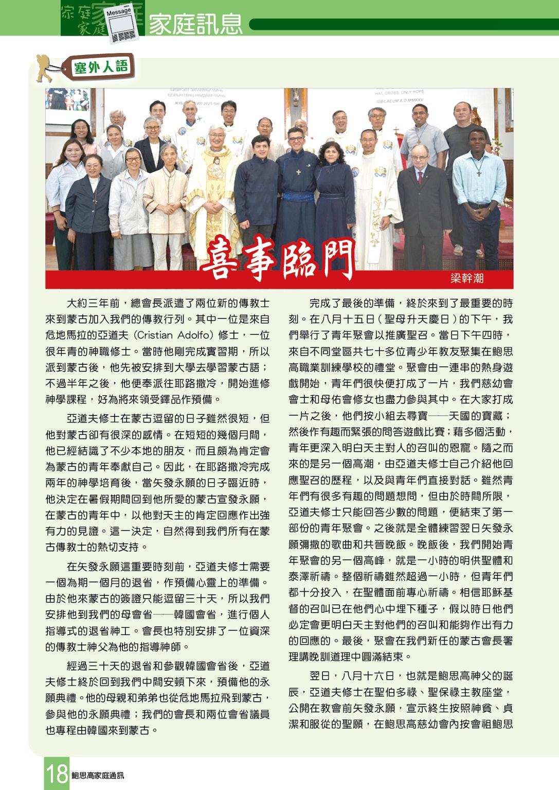 大約三年前,總會長派遣了兩位新的傳教士來到蒙古加入我們的傳教行列。其中一位是來自危地馬拉的亞道夫 (Cristian Adolfo) 修士,一位很年青的神職修士。當時他剛完成實習期,所以派到蒙古後,他先被安排到大學去學習蒙古語;不過半年之後,他便奉派往耶路撒冷,開始進修神學課程,好為將來領受鐸品作預備。