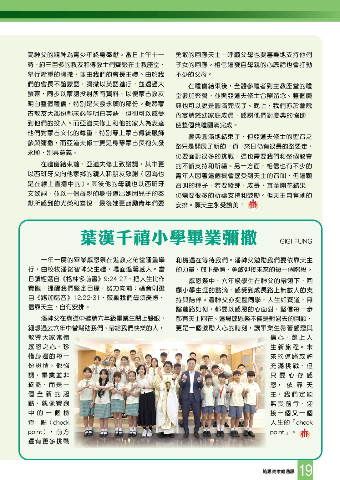 一年一度的畢業感恩祭在進教之佑堂隆重舉行,由校牧潘銘智神父主禮,場面溫馨感人。當日讀經選自《格林多前書》9:24-27,把人生比作賽跑,提醒我們堅定目標,努力向前;福音則選自《路加福音》12:22-31,鼓勵我們毋須憂慮,信靠天主,自有安排。