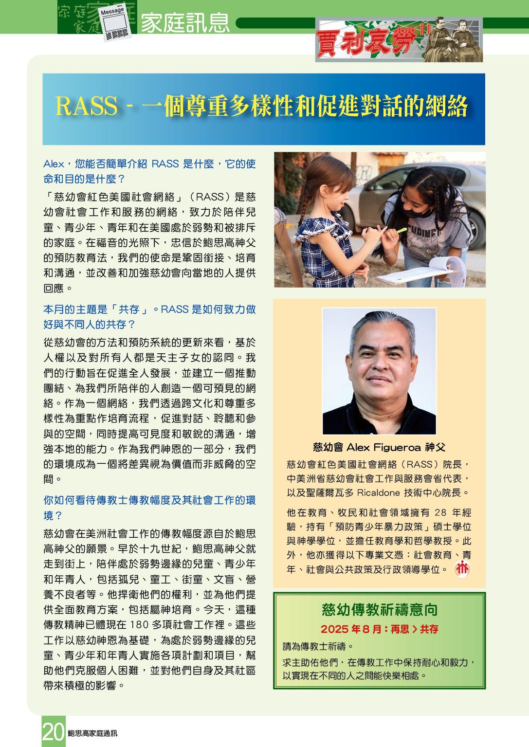 「慈幼會紅色美國社會網絡」(RASS)是慈幼會社會工作和服務的網絡,致力於陪伴兒童、青少年、青年和在美國處於弱勢和被排斥的家庭。在福音的光照下,忠信於鮑思高神父的預防教育法,我們的使命是鞏固銜接、培育和溝通,並改善和加強慈幼會向當地的人提供回應。