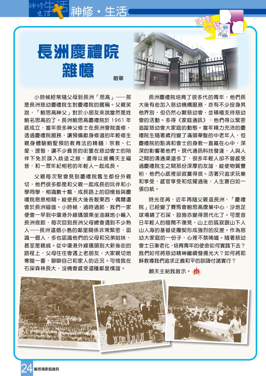 長洲慶禮院培育了很多代的青年,他們長大後有些加入慈幼機構服務,亦有不少投身其他界別,但仍然心繫慈幼會,並積極支持慈幼會的活動。多得《家庭通訊》,他們得以緊密追蹤慈幼會大家庭的動態。當年精力充沛的慶禮院生隨著歲月變了滿頭華髮的中老年人,但慶禮院的點滴和會士的身教一直藏在心中,深深的影響著他們。現代通訊科技發達,人與人之間的溝通渠道多了,很多年輕人卻不曾感受過慶禮院生之間那份深厚的友誼,縱使物質豐裕,他們心底裡卻寂寞得很。活著只追求玩樂和享受,感官享受和炫耀過後,人生蒼白如一張白紙。
