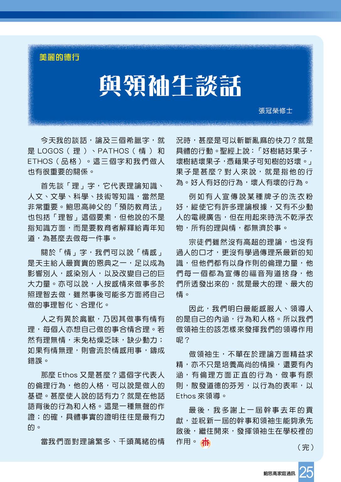 做領袖生,不單在於理論方面精益求精,亦不只是培養高尚的情操,還要有內涵,有倫理方面正直的行為,做事有原則,散發道德的芬芳,以行為的表率,以Ethos來領導。