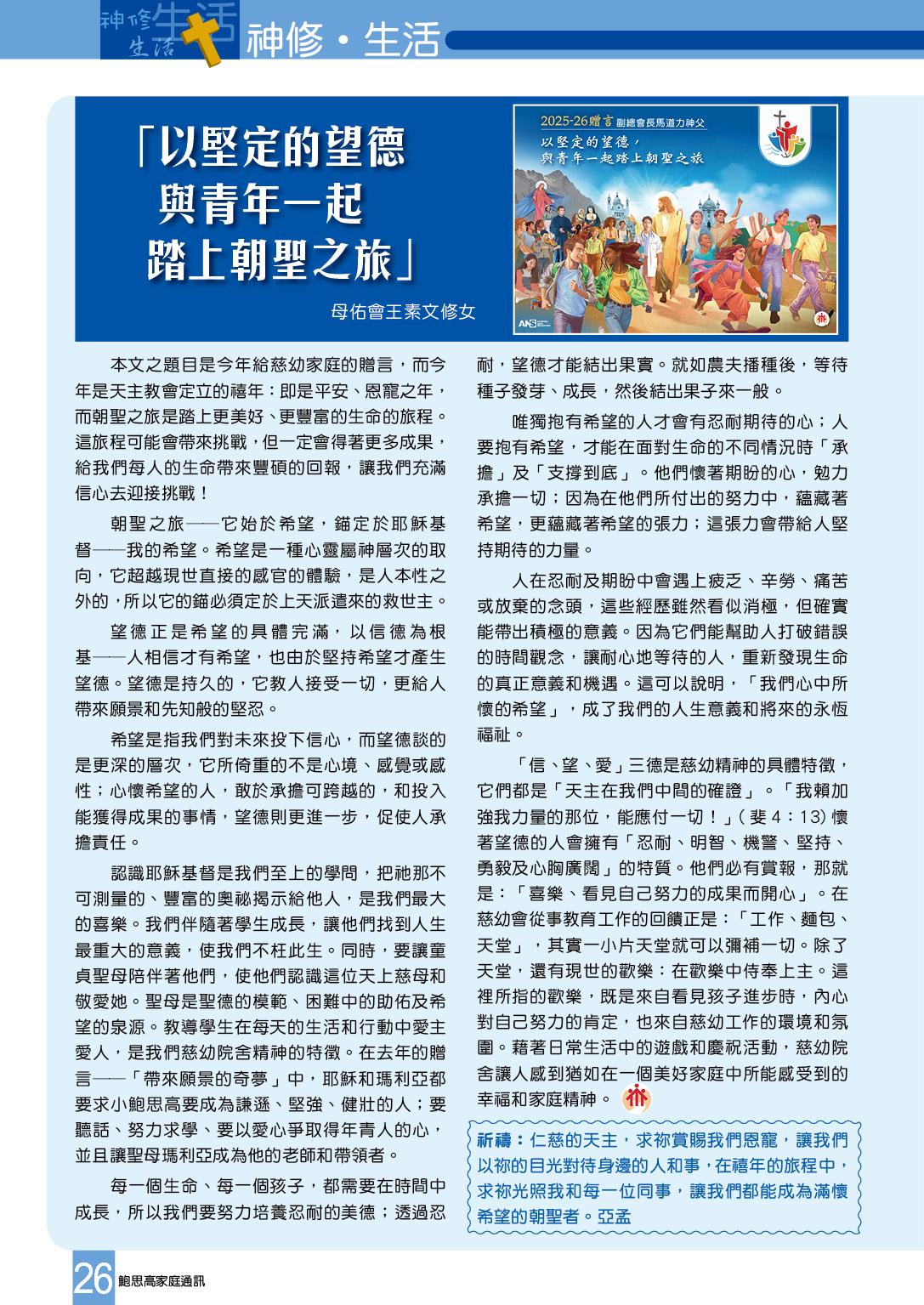本文之題目是今年給慈幼家庭的贈言,而今年是天主教會定立的禧年:即是平安、恩寵之年,而朝聖之旅是踏上更美好、更豐富的生命的旅程。這旅程可能會帶來挑戰,但一定會得著更多成果,給我們每人的生命帶來豐碩的回報,讓我們充滿信心去迎接挑戰!