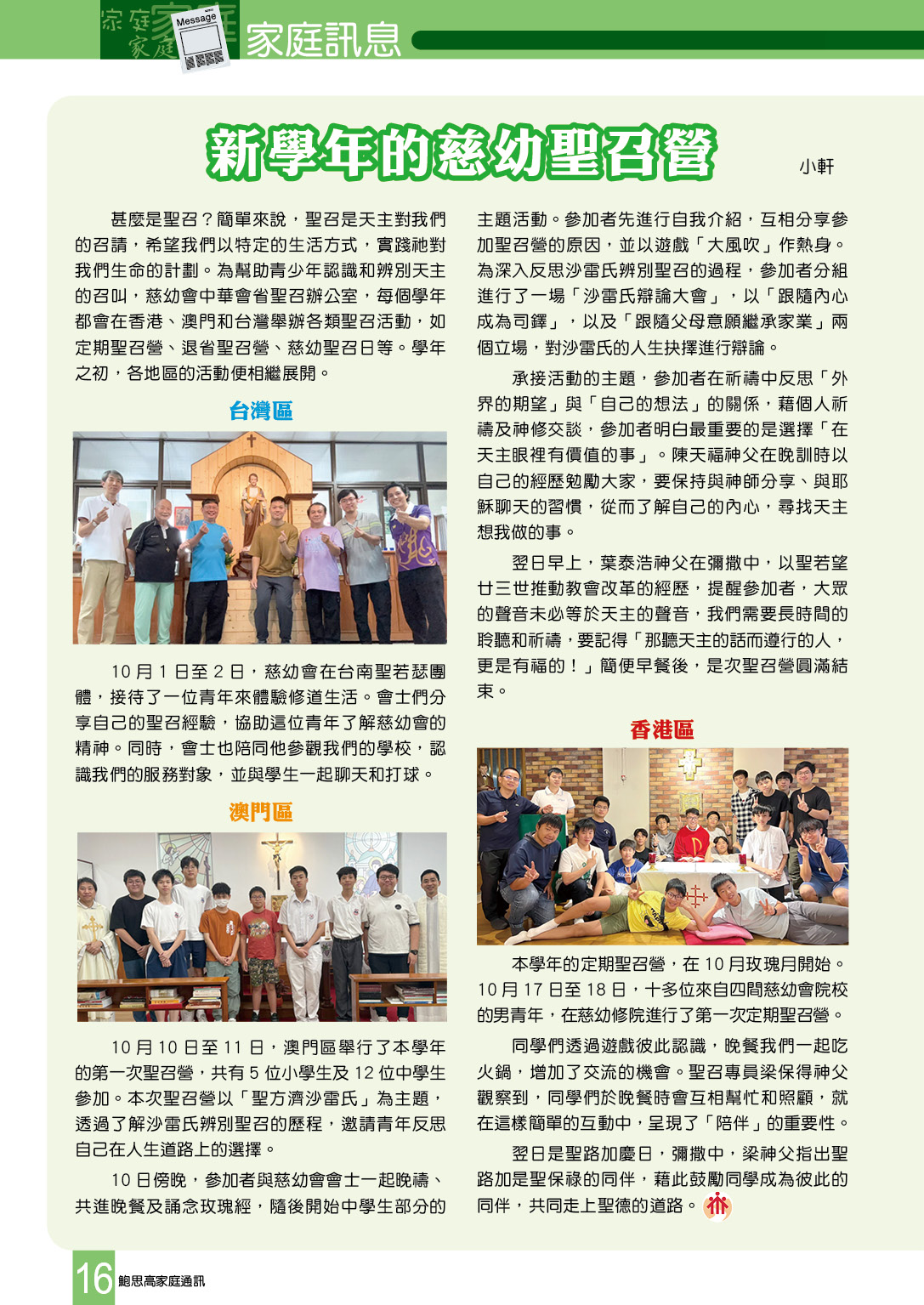 甚麼是聖召?簡單來說,聖召是天主對我們的召請,希望我們以特定的生活方式,實踐祂對我們生命的計劃。為幫助青少年認識和辨別天主的召叫,慈幼會中華會省聖召辦公室,每個學年都會在香港、澳門和台灣舉辦各類聖召活動,如定期聖召營、退省聖召營、慈幼聖召日等。學年之初,各地區的活動便相繼展開。