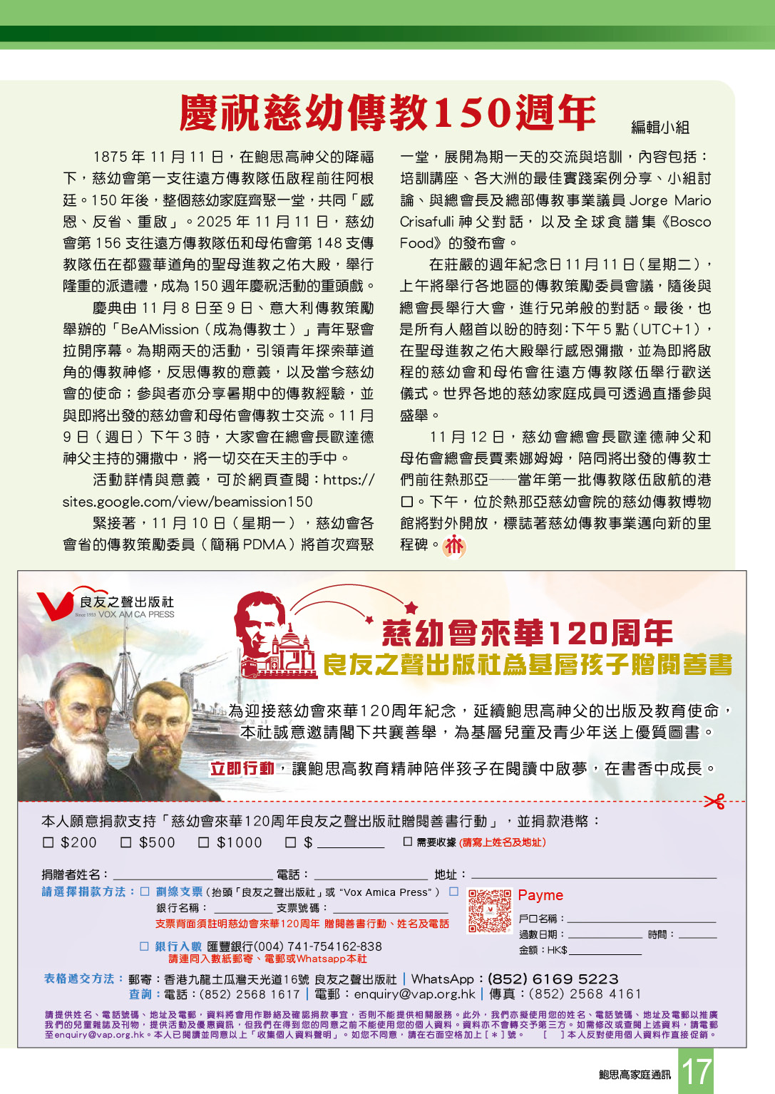 1875年11月11日,在鮑思高神父的降福下,慈幼會第一支傳教遠徵隊伍啟程前往阿根廷。150年後,整個慈幼會大家庭齊聚一堂,共同「感恩、反省、重啟」。2025年11月11日,慈幼會第156支傳教隊伍和聖母進教之佑孝女會第148支傳教隊伍在都靈華道角的聖母進教之佑大殿,舉行隆重的出發儀式,成為150週年慶祝活動的重頭戲。