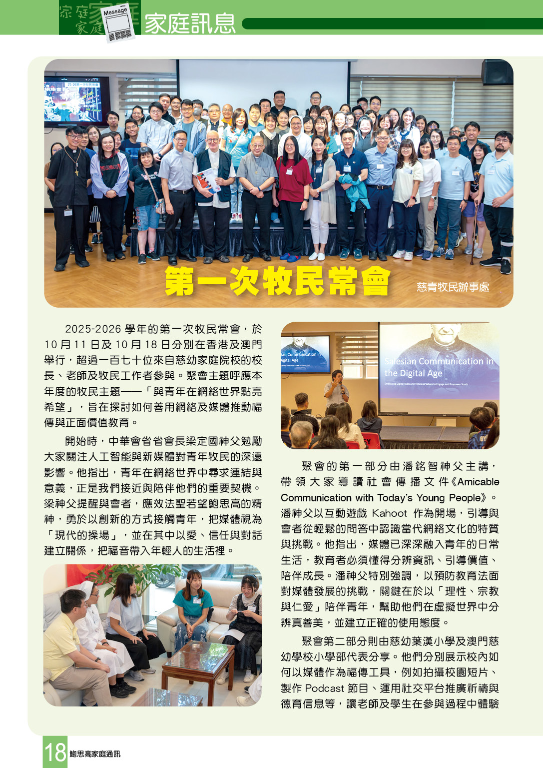 2025-2026學年的第一次牧民常會,於10月11日及10月18日分別在香港及澳門舉行,超過一百七十位來自慈幼家庭院校的校長、老師及牧民工作者參與。聚會主題呼應本年度的牧民主題——「與青年在網絡世界點亮希望」,旨在探討如何善用網絡及媒體推動福傳與正面價值教育。