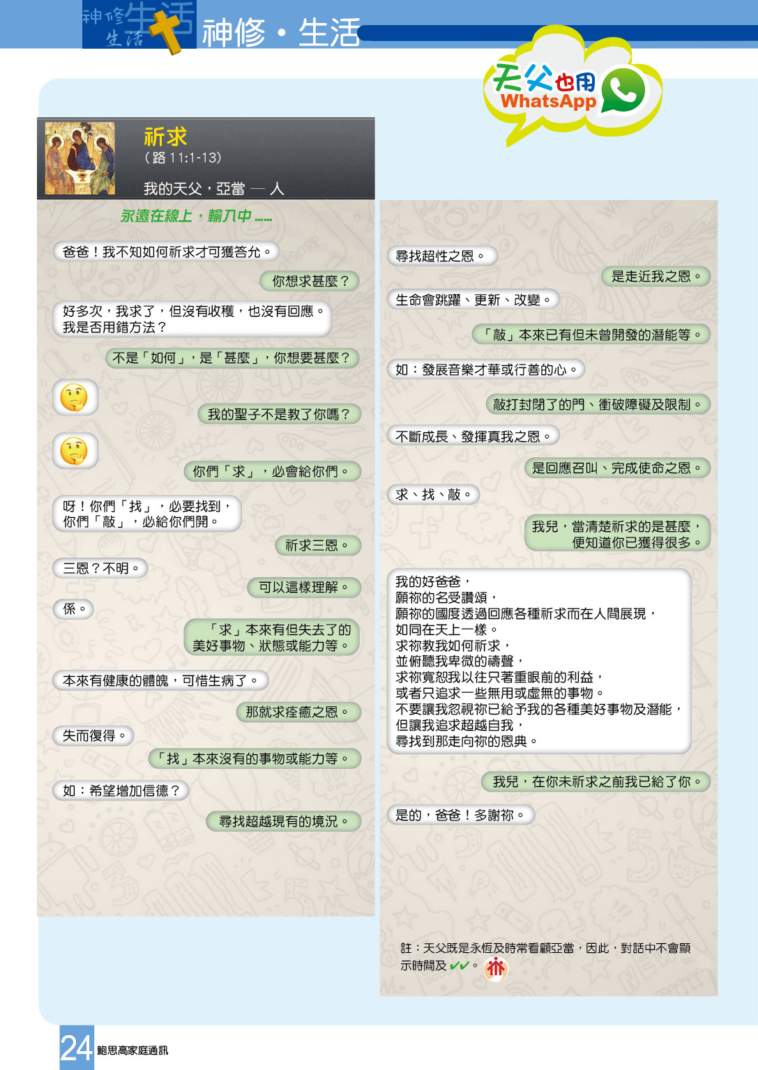 天父也用Whatsapp:如祂 標籤about 天父也用Whatsapp:祈求【309】 目 錄 舒卷話題【309】 唐嘉蒂修女–虔誠的女性、傳教士、和平締造者 瑪利亞唐嘉蒂修女被冊封為聖人 總會長訊息:撒種者「在黑暗中撒種」那神聖的愚昧 總會長訊息:從法利塞人的餐桌談牧民服務的核心 預防教育法—來自天主之心的禮物 鳴謝【309】 慈青開學感恩祭2025 凝聚慈幼家庭 傳承鮑聖夢想 新學年的慈幼聖召營 慶祝慈幼傳教150週年 第一次牧民常會 慈青與善會同學悼念已亡會士 塞外人語:退休?【309】 慈幼會澳門屬校校董會晚宴 賈利哀勞 11:在中東的傳教士 – 是什麼使我們團結【309】 世界之窗【309】 天父也用Whatsapp:祈求【309】 讀者心聲:生活中的宗教 八個八個 追蹤胡子義神父的朝聖人生 首位皈依天主教之英國高級王室成員逝世 封底:聖瑪利亞唐嘉蒂封聖大典【309】