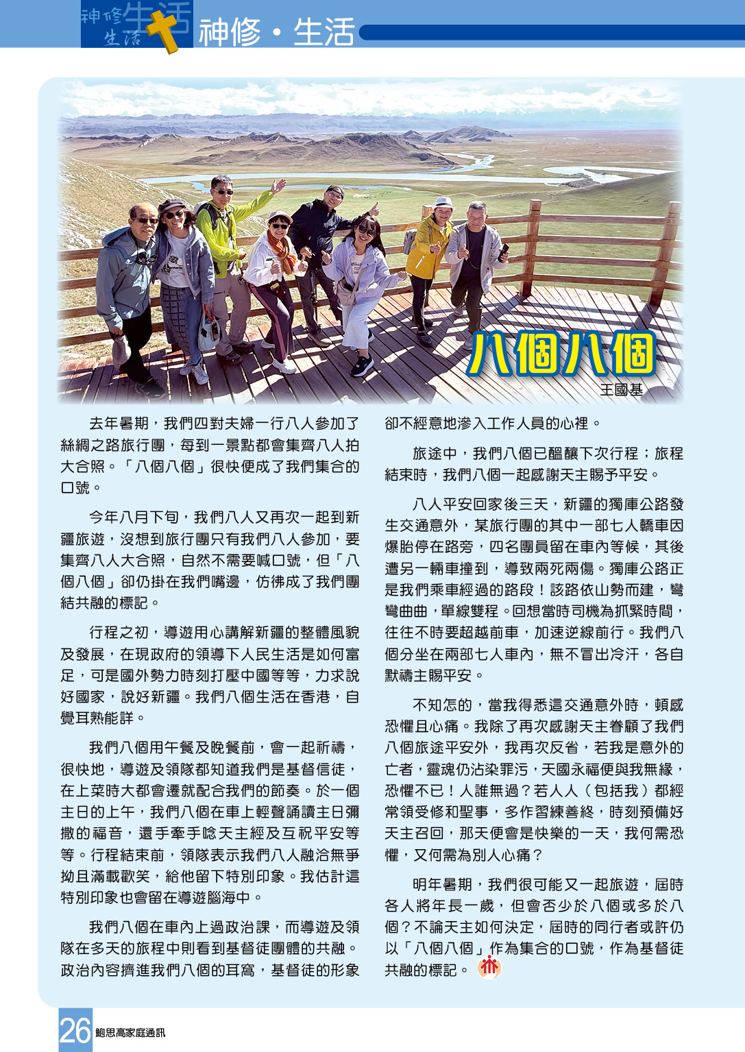 明年暑期,我們很可能又一起旅遊,屆時各人將年長一歲,但會否少於八個或多於八個?不論天主如何決定,屆時的同行者或許仍以「八個八個」作為集合的口號,作為基督徒共融的標記。