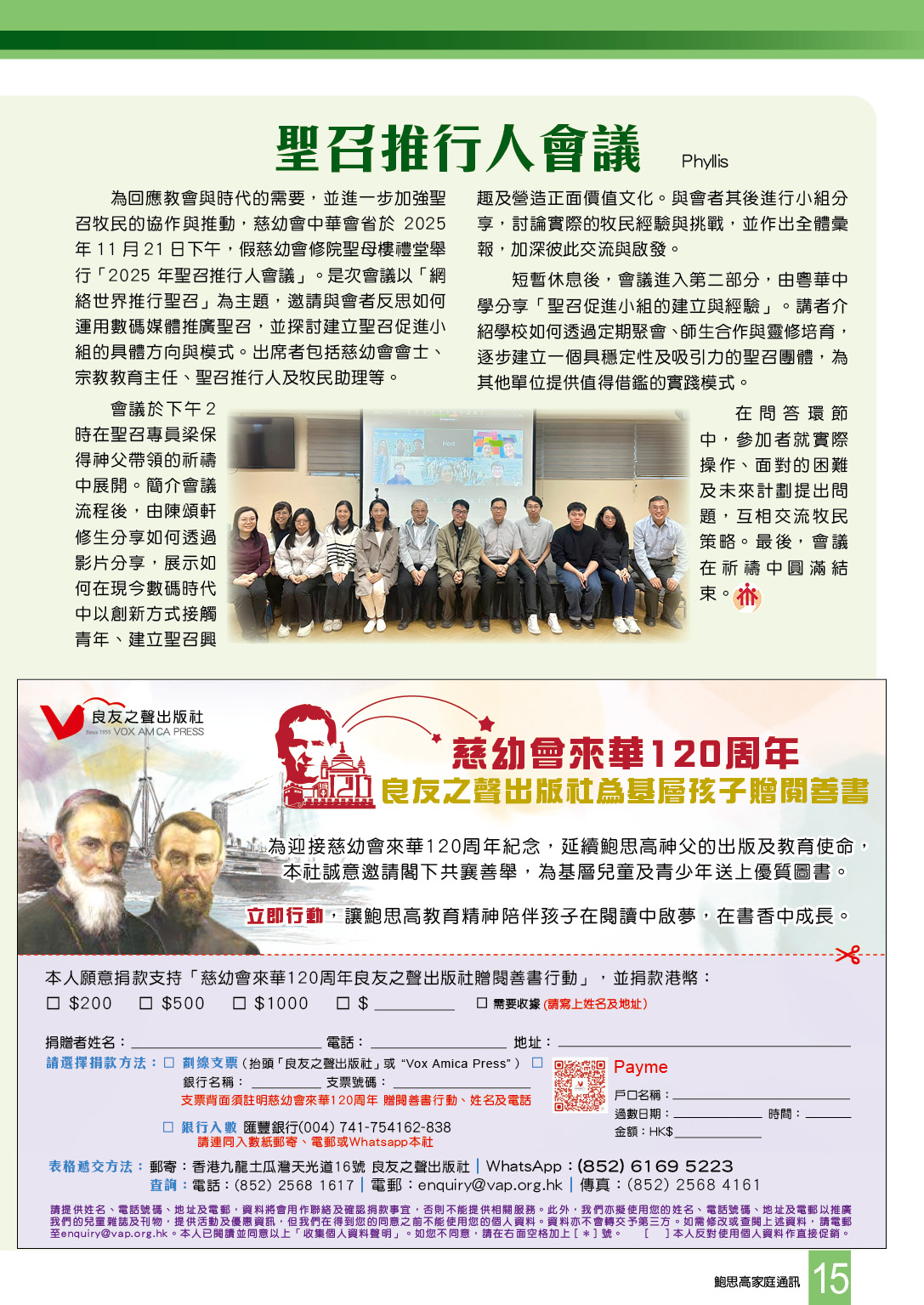 為回應教會與時代的需要,並進一步加強聖召牧民的協作與推動,慈幼會中華會省於 2025年11月21日下午,假慈幼會修院聖母樓禮堂舉行「2025 年聖召推行人會議」。是次會議以「網絡世界推行聖召」為主題,邀請與會者反思如何運用數碼媒體推廣聖召,並探討建立聖召促進小組的具體方向與模式。出席者包括慈幼會會士、宗教教育主任、聖召推行人及牧民助理等。