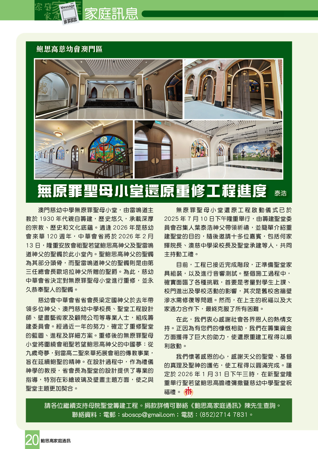 請各位繼續支持母院聖堂籌建工程。捐款詳情可聯絡《鮑思高家庭通訊》陳先生查詢。