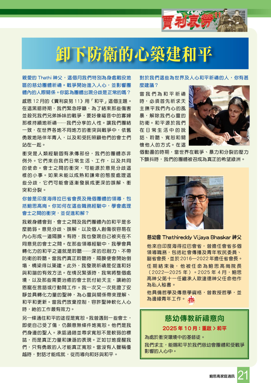 感恩12月的《賈利哀努11》用「和平」這個主題。在這黑暗時期,我們緊急呼籲,為了結束那些傷害並殺死我們兄弟姊妹的戰爭,要好像福音中的寡婦那樣持續地祈禱 ── 我們分享的人性。讓我們團結一致,在世界各地不同地方的衝突與戰爭中,依舊勇敢地陪伴年青人,以及和受託照顧他們的會士們站在一起。