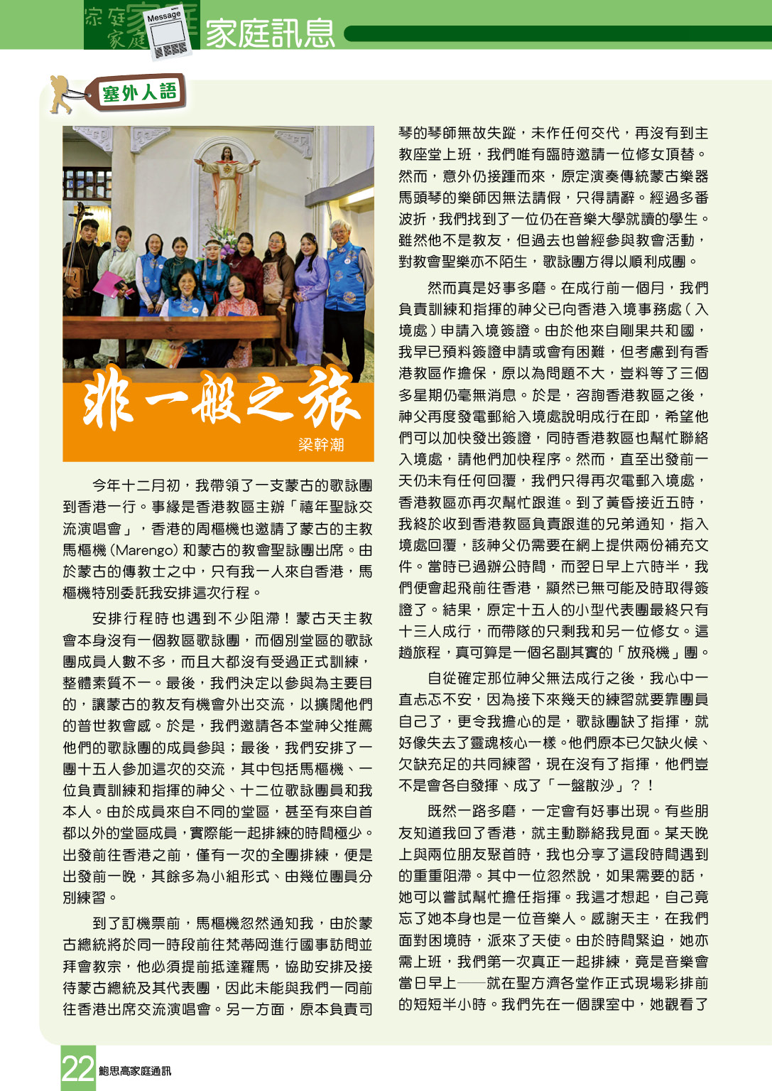 今年十二月初,我帶領了一支蒙古的歌詠團到香港一行。事緣是香港教區主辦「禧年聖詠交流演唱會」,香港的周樞機也邀請了蒙古的主教馬樞機(Marengo)和蒙古的教會聖詠團出席。由於蒙古的傳教士之中,只有我一人來自香港,馬樞機特別委託我安排這次行程。