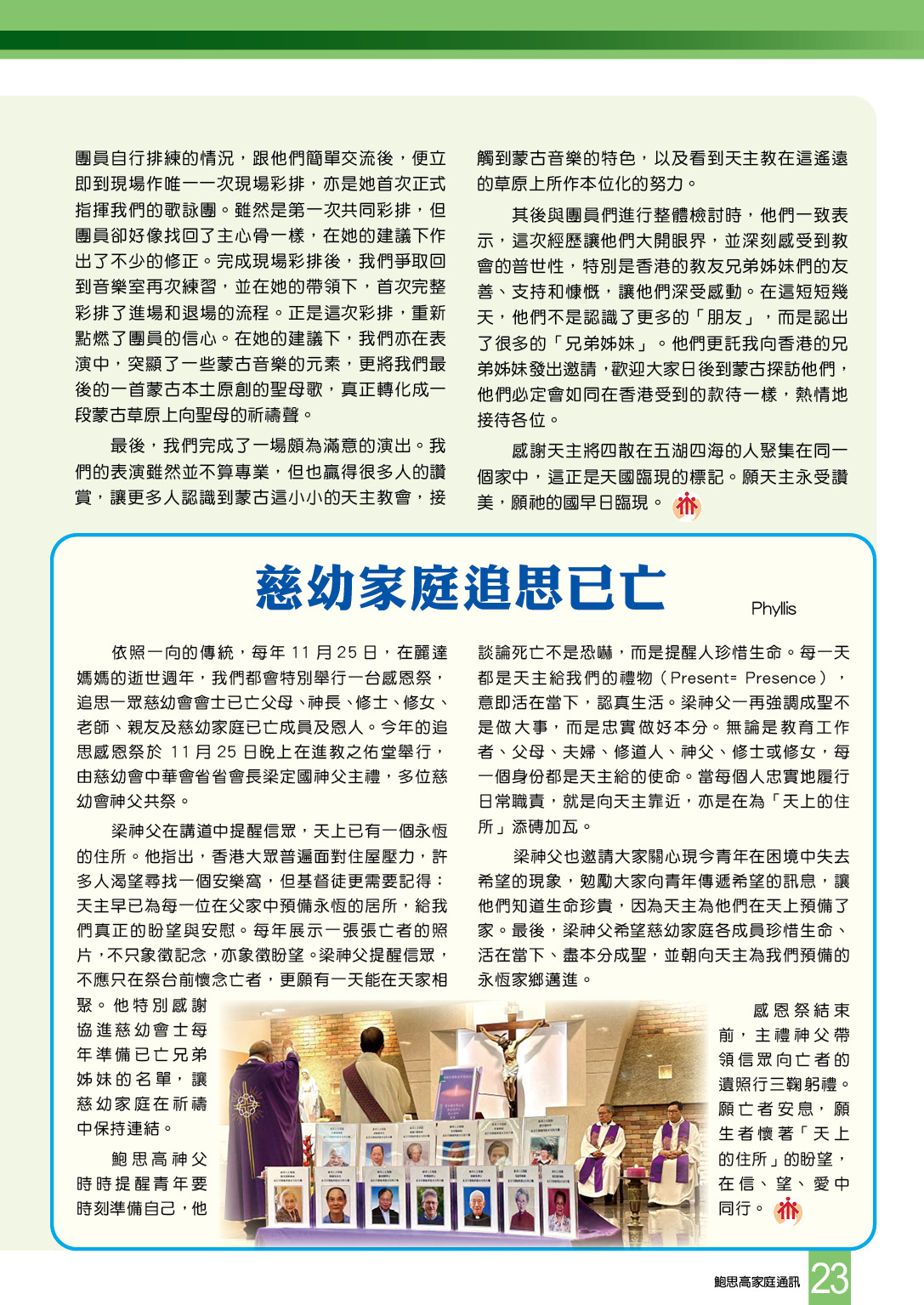 依照一向的傳統,每年11月25日,在麗達媽媽的逝世週年,我們都會特別舉行一台感恩祭,追思一眾慈幼會會士已亡父母、神長、修士、修女、老師、親友及慈幼家庭已亡成員及恩人。今年的追思感恩祭於 11月25日晚上在進教之佑堂舉行,由慈幼會中華會省省會長梁定國神父主禮,多位慈幼會神父共祭。