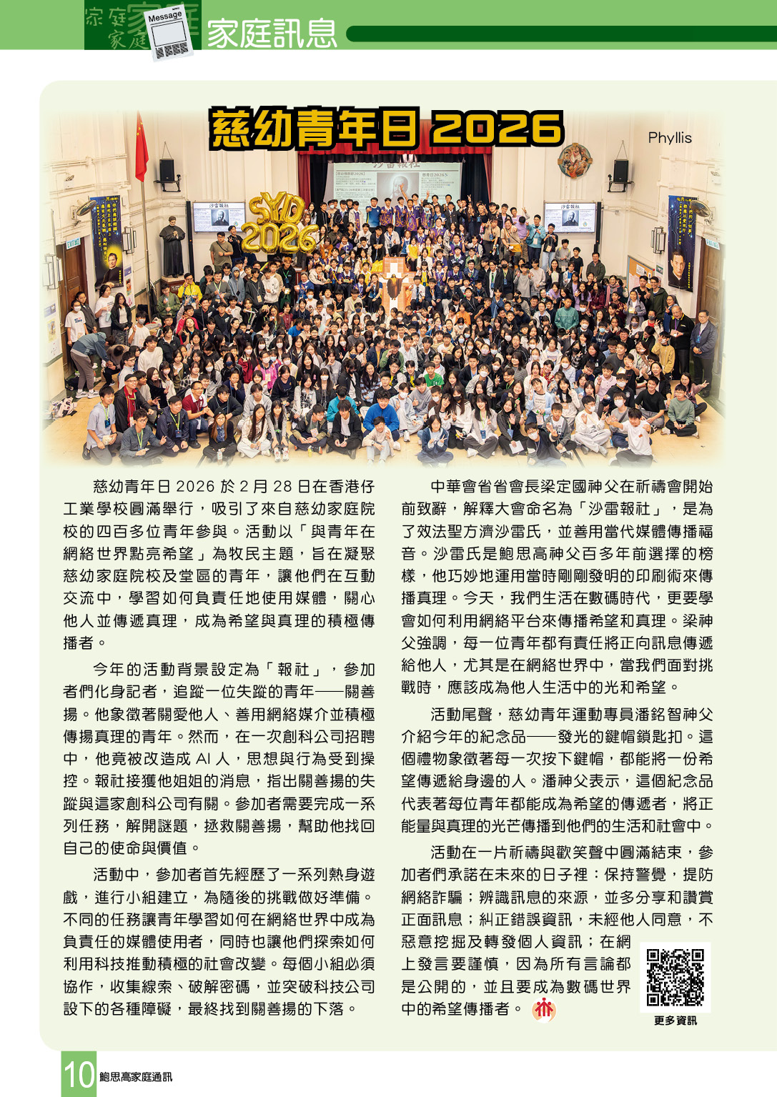 慈幼青年日2026於2月28日在香港仔工業學校圓滿舉行,吸引了來自慈幼家庭院校的四百多位青年參與。活動以「與青年在網絡世界點亮希望」為牧民主題,旨在凝聚慈幼家庭院校及堂區的青年,讓他們在互動交流中,學習如何負責任地使用媒體,關心他人並傳遞真理,成為希望與真理的積極傳播者。