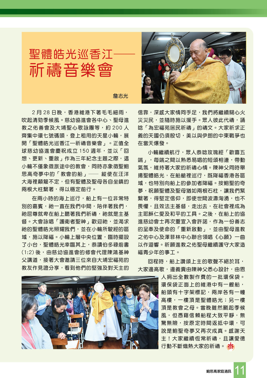 2月28日晚,香港維港下著毛毛細雨,吹起清勁季候風。慈幼協進會各中心、聖母進教之佑善會及大埔聖心歌詠團等,約200人齊集中環七號碼頭,登上租用的天星小輪,展開「聖體皓光巡香江—祈禱音樂會」。正值全球慈幼協進會慶祝成立150周年,並以「回想、更新、重啟」作為三年紀念主題之際,這小輪不僅象徵旅途中的教會,同時亦象徵聖鮑思高奇夢中的「教會的船」──縱使在汪洋大海裡顛簸不定,但有聖體及聖母各自坐鎮的兩根大柱繫著,得以穩定前行。
