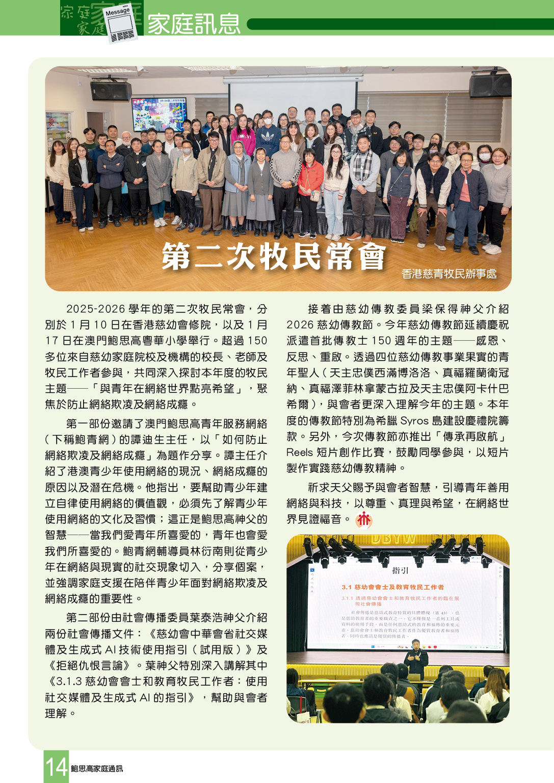 2025-2026學年的第二次牧民常會,分別於1月10日在香港慈幼會修院,以及1月17日在澳門鮑思高粵華小學舉行。超過150多位來自慈幼家庭院校及機構的校長、老師及牧民工作者參與,共同深入探討本年度的牧民主題──「與青年在網絡世界點亮希望」,聚焦於防止網絡欺凌及網絡成癮。