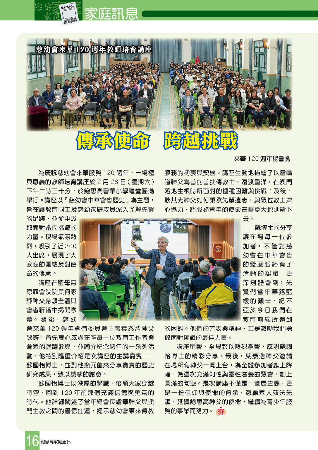 為慶祝慈幼會來華服務120週年,一場極具意義的教師培育講座於2月28日(星期六)下午二時三十分,於鮑思高粵華小學禮堂圓滿舉行。講座以「慈幼會中華會省歷史」為主題,旨在讓教育同工及慈幼家庭成員深入了解先賢的足跡,並從中汲取面對當代挑戰的力量。現場氣氛熱烈,吸引了近300人出席,展現了大家庭的團結及對使命的傳承。