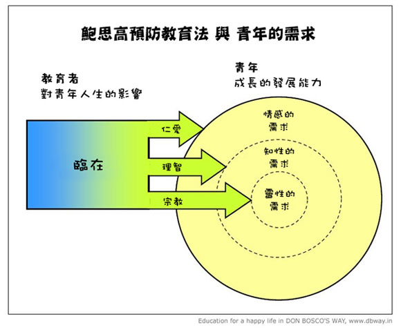1) 需求為本的教育 鮑思高神父是一位 積極的實在主義者。 鮑思高深信沒有「壞孩子」這回事︰「每一個年輕人,就算是最頑劣的青年,總會有一些優點。教育者的首要工作,就是去發掘那些潛於青年中的優點,這就是存於他們心靈內的美好一面。」( MB, vol. 5, 367 ) 鮑思高神父明白到,有許多的事物會阻礙一個人從童年到成年的成長。經過他 40 多年教育青年的經驗,他深信真正的教育,就是去回應紮根於青年的內心、理智和靈魂上的渴望;即是回應每一位青年的三個基本需要:情感、求知和靈性。 為了適當地回應這些需要,他綜合出三個重要的元素作為教育法基礎:仁愛、理智和宗教。因此,在預防教育法中︰