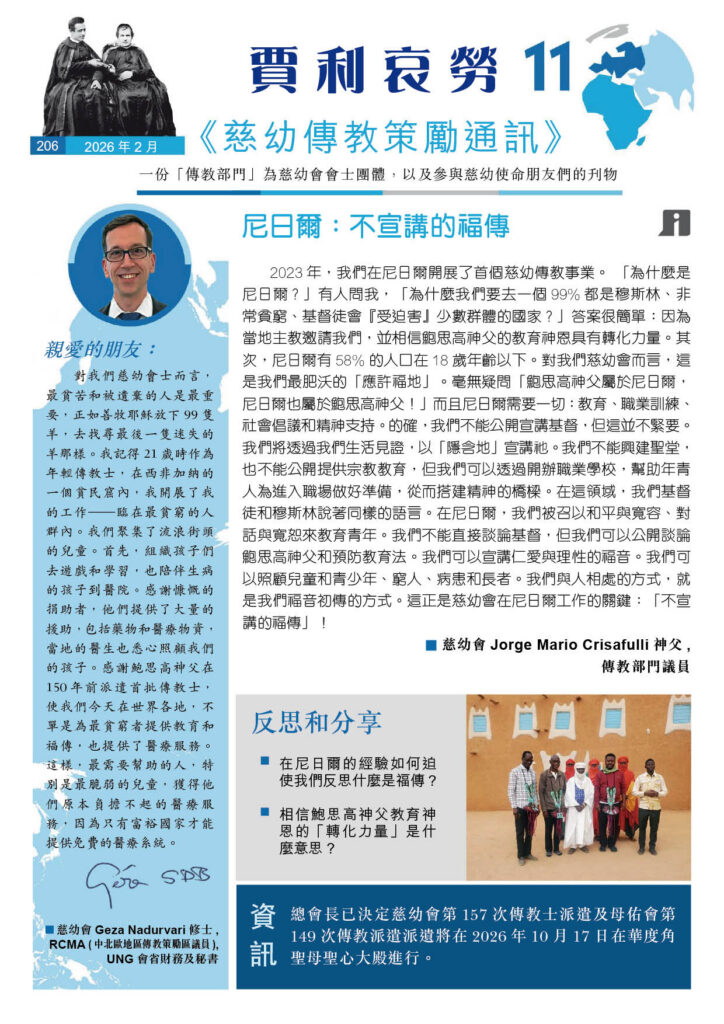 2023年,我們在尼日爾開展了首個慈幼傳教事業。 「為什麼是尼日爾?」有人問我,「為什麼我們要去一個99%都是穆斯林、非常貧窮、基督徒會『受迫害』少數群體的國家?」答案很簡單:因為當地主教邀請我們,並相信鮑思高神父的教育神恩具有轉化力量。其次,尼日爾有58%的人口在18歲年齡以下。對我們慈幼會而言,這是我們最肥沃的「應許福地」。毫無疑問「鮑思高神父屬於尼日爾,尼日爾也屬於鮑思高神父!」而且尼日爾需要一切:教育、職業訓練、社會倡議和精神支持。的確,我們不能公開宣講基督,但這並不緊要。我們將透過我們生活見證,以「隱含地」宣講祂。我們不能興建聖堂,也不能公開提供宗教教育,但我們可以透過開辦職業學校,幫助年青人為進入職場做好準備,從而搭建精神的橋樑。在這領域,我們基督徒和穆斯林說著同樣的語言。在尼日爾,我們被召以和平與寬容、對話與寬恕來教育青年。我們不能直接談論基督,但我們可以公開談論鮑思高神父和預防教育法。我們可以宣講仁愛與理性的福音。我們可以照顧兒童和青少年、窮人、病患和長者。我們與人相處的方式,就是我們福音初傳的方式。這正是慈幼會在尼日爾工作的關鍵:「不宣講的福傳」 !