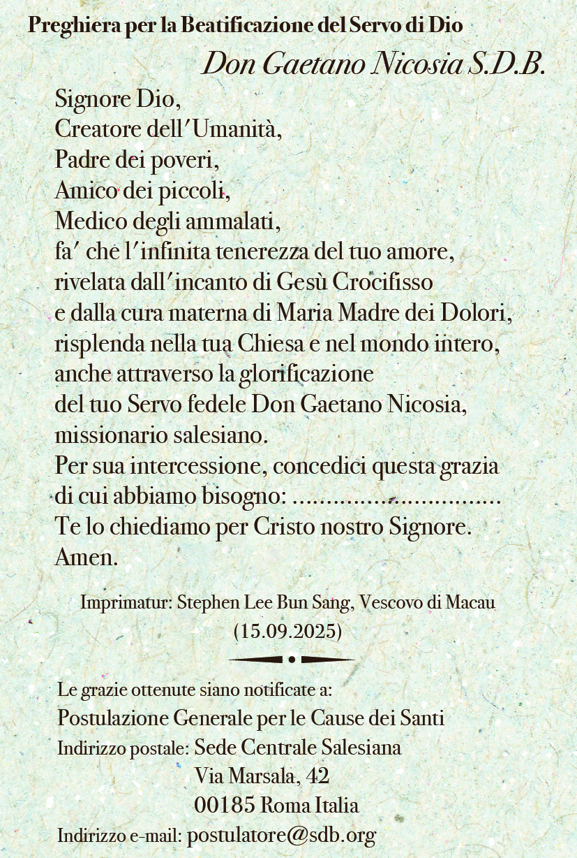 Rispondendo alla diffusa convinzione che nella vita e nel lavoro di Don Gaetano Nicosia Dio ha impresso uno splendido segno della sua amorosa presenza, il Vescovo di Macau Mons. Stephen Lee Bun Sang il 17 gennaio 2026, nella Chiesa dell'Addolorata a Coloane, circondato da una folla di fedeli, ha dato pubblico inizio alla Inchiesta Diocesana sulla fama di santità e di segni e sulla eroicità delle virtù del "Servo di Dio Don Gaetano Nicosia, missionario salesiano in Cina".